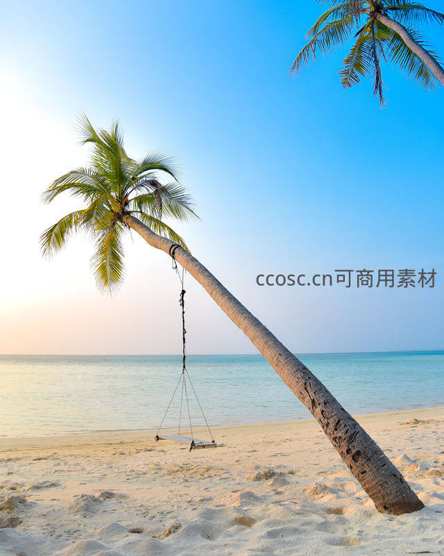 斜倚椰树下的秋千,夕阳海景浪漫满分