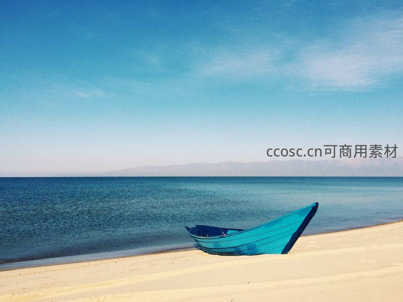 一艘亮蓝色的小船停靠在金色沙滩上,背景是平静的蔚蓝大海和远处朦胧的山脉,画面充满宁静与悠闲的度假氛围。