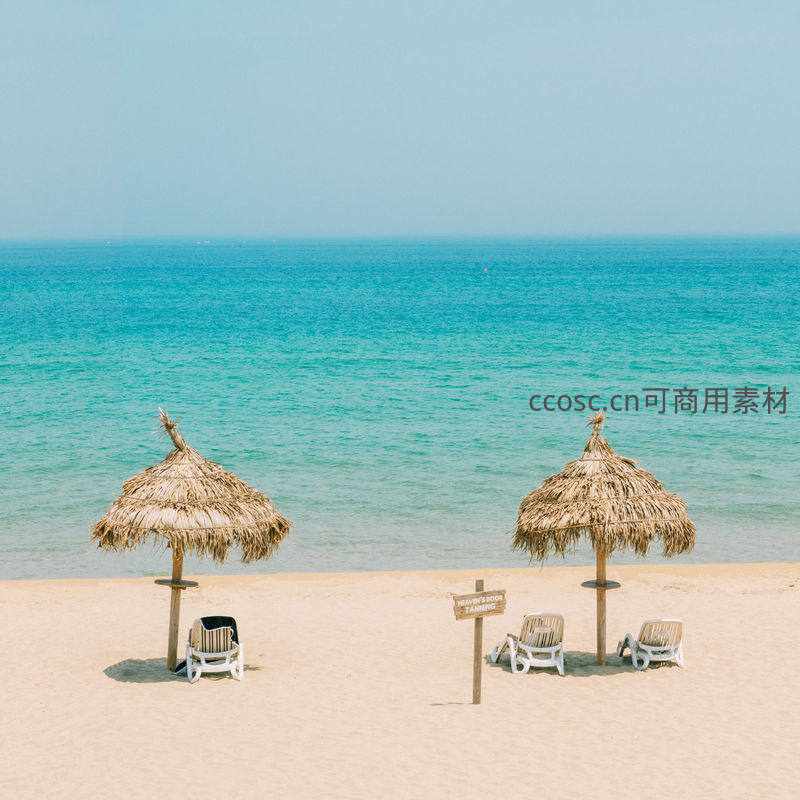 茅草伞下空躺椅,碧海蓝天无垠沙滩