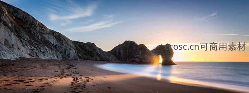 晨曦初照,金色阳光穿透天然岩石拱门,海浪如丝绸般柔滑掠过沙滩,左侧陡峭岩壁巍峨壮观,展现大自然鬼斧神工的壮丽景象。