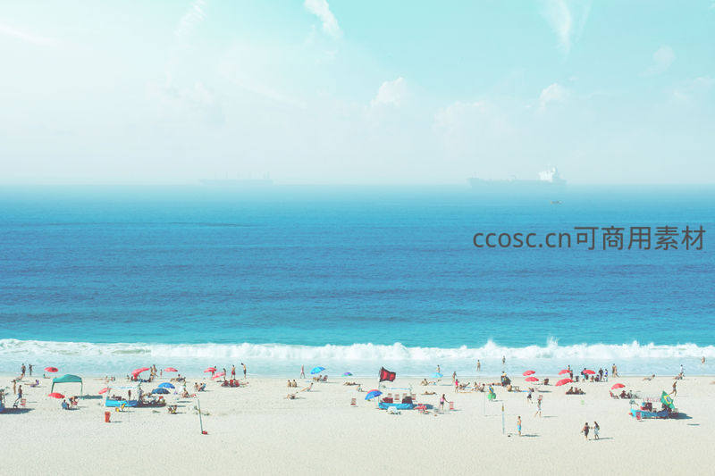 宽阔的沙滩上挤满了享受阳光的游客,五彩缤纷的遮阳伞星罗棋布,远处的海平面上隐约可见巨大的货轮,展现出热闹喧嚣的海滨假日景象。