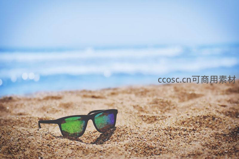 一副黑色墨镜静静地躺在细腻的沙滩上,镜片反射出波光粼粼的蔚蓝大海,是夏日海边度假不可或缺的时尚单品。