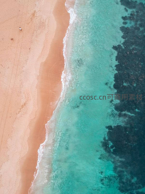 从高空俯瞰,细腻沙滩与透明浅海形成鲜明分界,水下礁石若隐若现,尽显大自然鬼斧神工的色彩与线条。