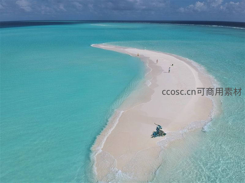 从高空俯瞰,细长沙洲如玉带漂浮于湛蓝海面,游客漫步其上,四周海水清澈见底,宛若人间仙境般梦幻绝美。