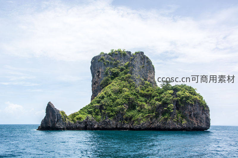 一座典型的喀斯特地貌岛屿,陡峭的石灰岩壁上覆盖着浓密的热带雨林,四周被湛蓝海水包围,充满原始野性之美。