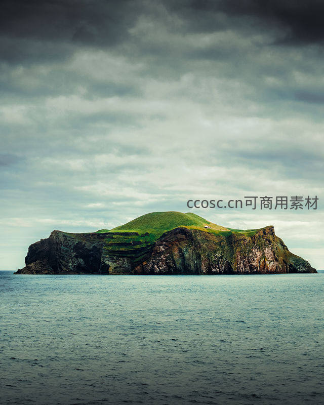 厚重的乌云笼罩着海面,一座顶部覆盖着翠绿草甸的孤岛静静伫立,岩石峭壁在光影下显得苍凉而神秘。