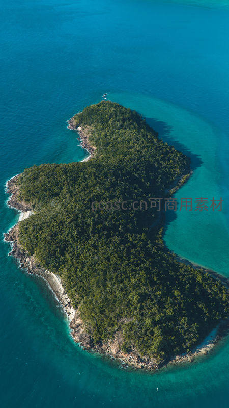 从高空俯瞰,一座被碧蓝海水温柔环抱的热带岛屿,岛上覆盖着茂密的原始森林,海岸线蜿蜒曲折,尽显自然之美。