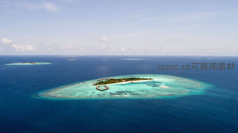 马尔代夫的空中视角,展现了一个被清澈环礁湖包围的私人岛屿,岛上点缀着奢华度假村和水上别墅,是理想的度假胜地。