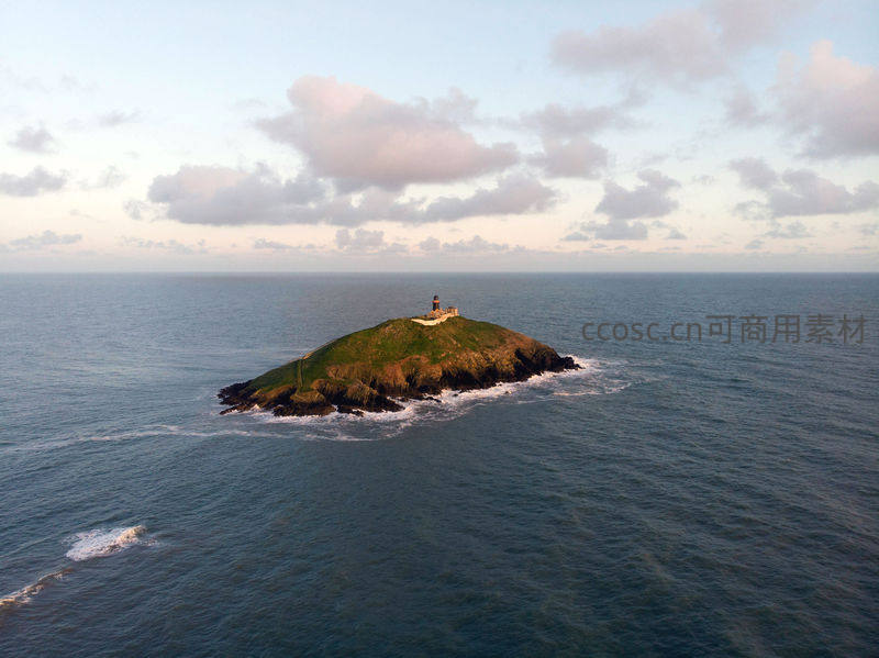 夕阳西下,一座孤岛矗立于茫茫大海之中,顶端的灯塔在柔和光线下静静伫立,仿佛是为迷途者指引方向的孤独守护者。