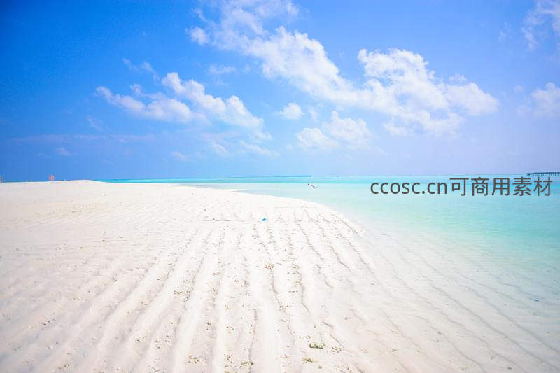 洁白细腻的沙滩延伸至清澈见底的碧蓝海水,头顶是万里无云的湛蓝天空,构成一幅极致纯净的海滨画卷。