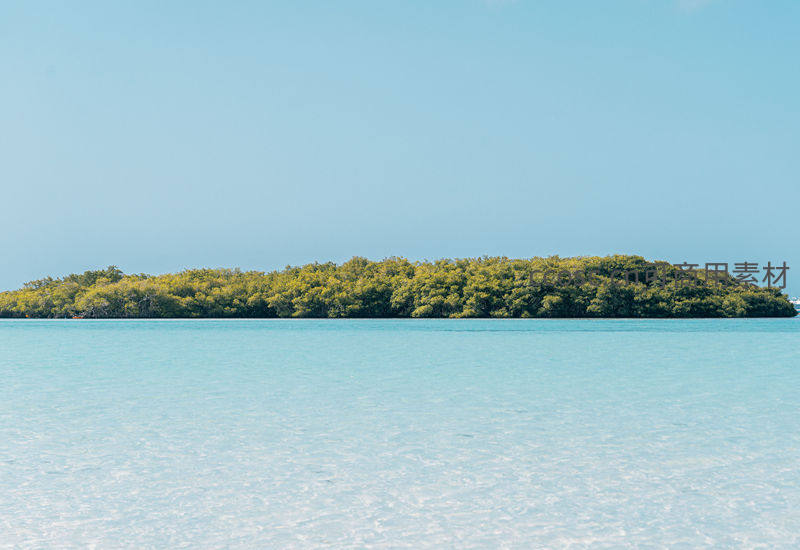 平静的浅蓝色海面上,一座覆盖着茂密绿色植被的狭长小岛静静伫立,展现出原始而宁静的自然之美。