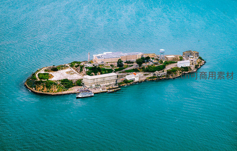 从空中俯瞰位于旧金山湾中的恶魔岛,岛上历史悠久的监狱建筑群清晰可见,一艘游船正缓缓驶向码头,充满历史沧桑感。