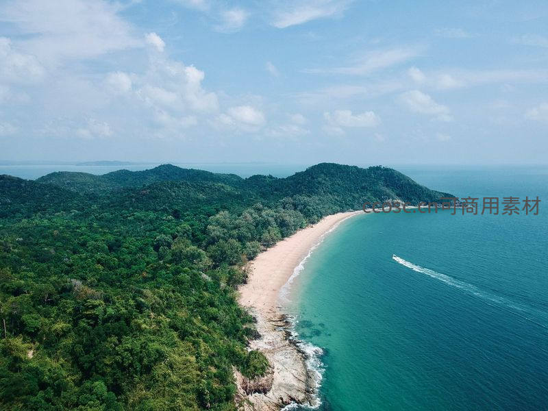 茂密的热带雨林紧贴着蜿蜒的金色沙滩,一直延伸到碧绿的海水中,一艘快艇划过水面留下白痕,展现原始而宁静的海滨风光。