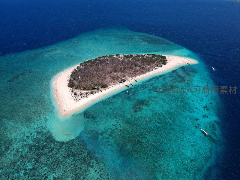 从空中俯视,一座被透明浅蓝色珊瑚礁环抱的心形沙洲清晰可见,岛上绿意盎然,几艘小船点缀其间,是大自然鬼斧神工造就的浪漫秘境。