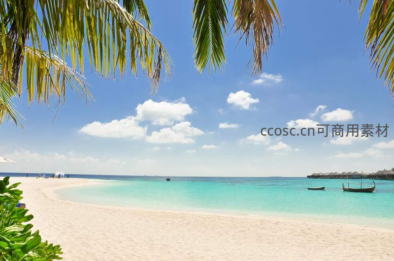 透过摇曳的椰叶,眼前是无垠的洁白沙滩与渐变的碧蓝海水,远处水上别墅若隐若现,几艘小船静泊岸边,这里是逃离尘嚣、享受慵懒时光的完美之地。