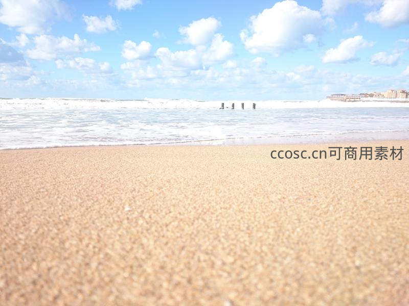 镜头贴近沙面,捕捉到细腻的沙粒质感,远处是翻滚的白色浪花和蔚蓝的天空,几根木桩和远处的建筑若隐若现,营造出宁静的海滨氛围。