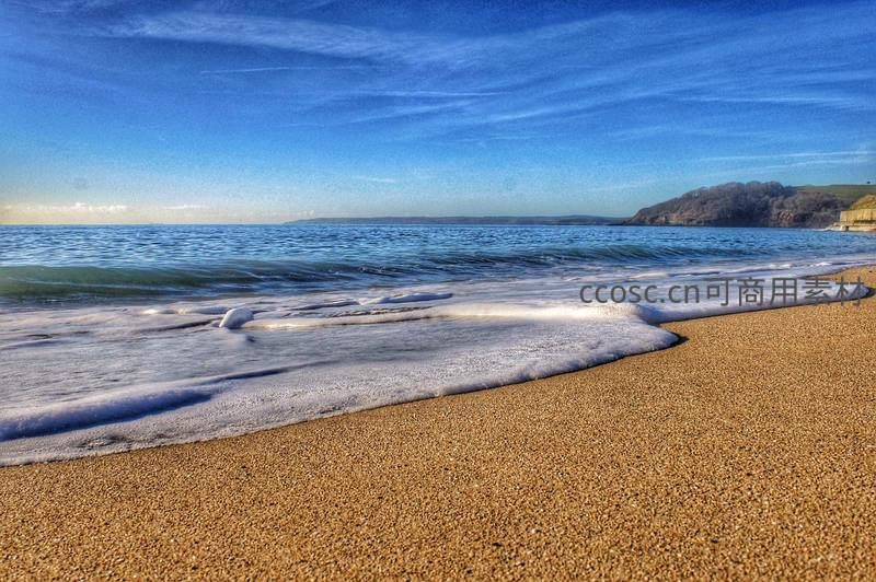 细腻的金黄沙滩上,洁白的浪花温柔拍打,远处青山与碧海相接,构成一幅宁静祥和的海滨画卷。