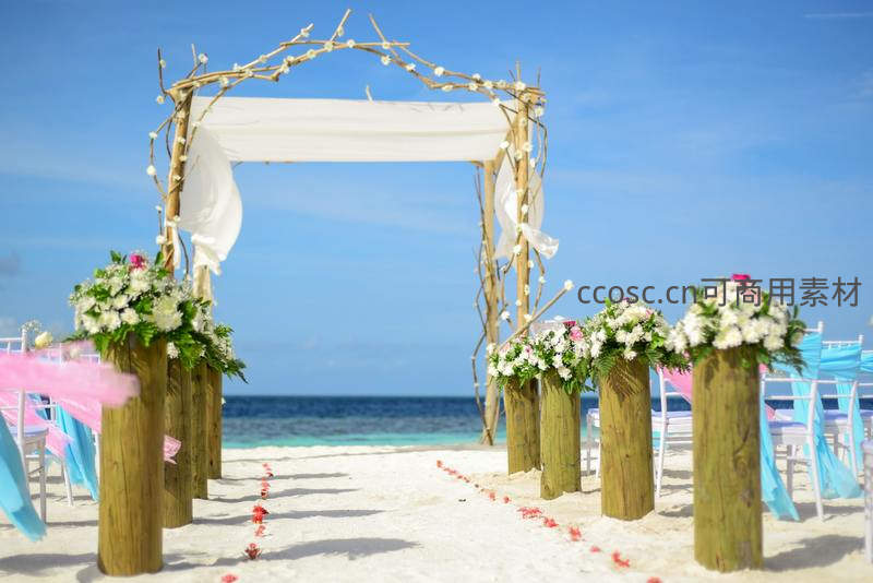 海边婚礼拱门鲜花绽放浪漫满溢