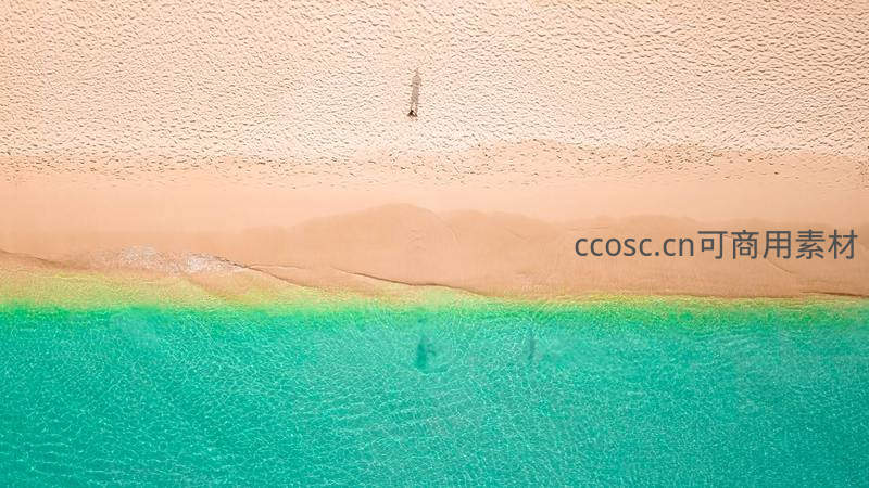 从正上方俯瞰,一人独自伫立在绵延的浅色沙滩边缘,脚下是晶莹剔透的碧绿海水,画面静谧而富有诗意。