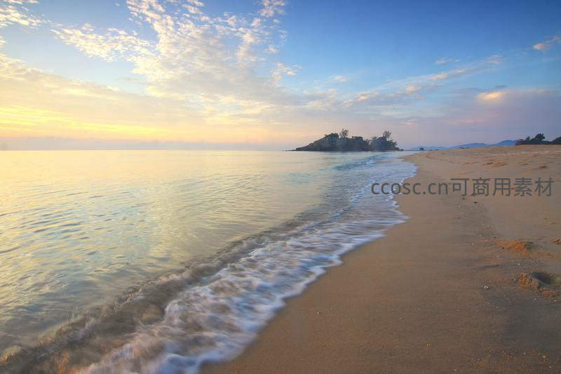 夕阳染黄天际,金色光芒洒满海面与沙滩,远方小岛静谧伫立,海浪温柔拍岸,营造出极致治愈的黄昏时刻。