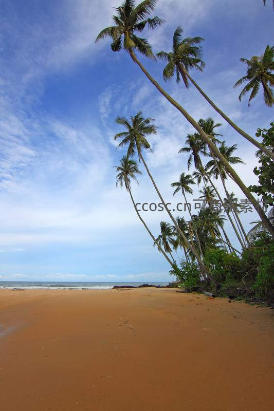 金色沙滩旁高耸的椰子树在蓝天白云下摇曳,海风轻拂,营造出宁静惬意的热带海岛度假氛围。