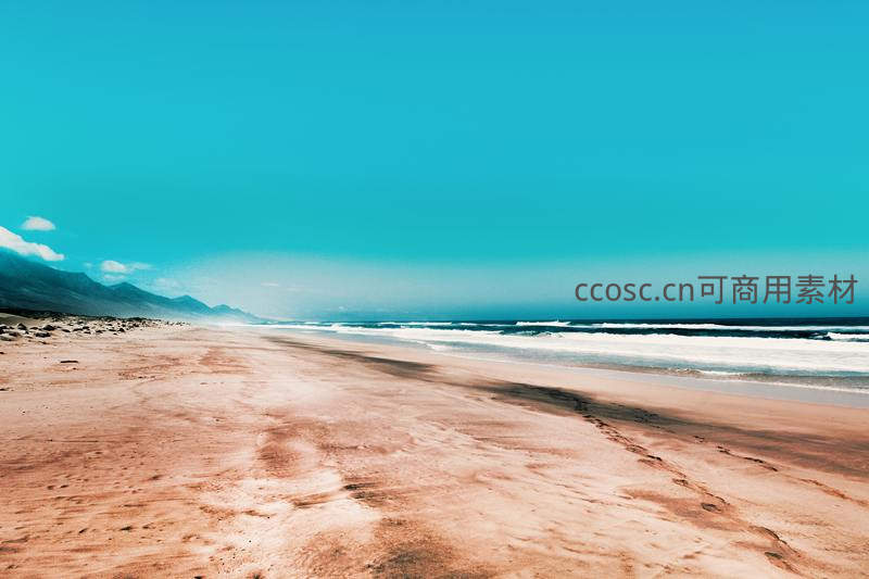 无垠的碧蓝大海与金黄沙滩相接,远处山脉若隐若现,浪花轻拍岸边,尽显壮阔而宁静的海滨美景。