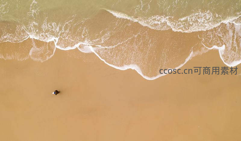 从高空俯瞰,一人独行于广阔沙滩之上,身后是层层叠叠的白色浪花,画面简洁却充满诗意与宁静感。