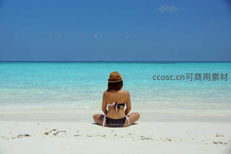 一位戴着草帽的女子背对镜头,坐在洁白的沙滩上,凝望一望无际的碧蓝海水与晴朗天空,享受着悠闲的假期时光。