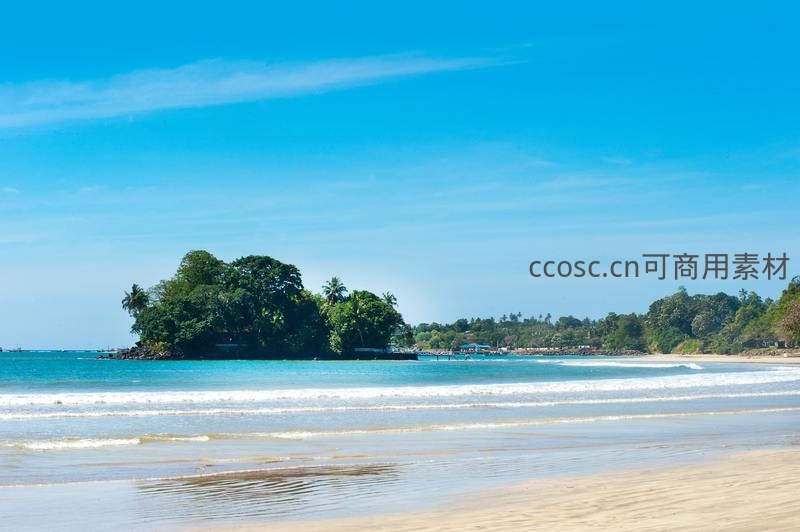 蔚蓝天空下,一座被茂密绿树覆盖的小岛静立海中,洁白沙滩延伸至远方,海浪温柔拍岸,构成一幅宁静的热带画卷。