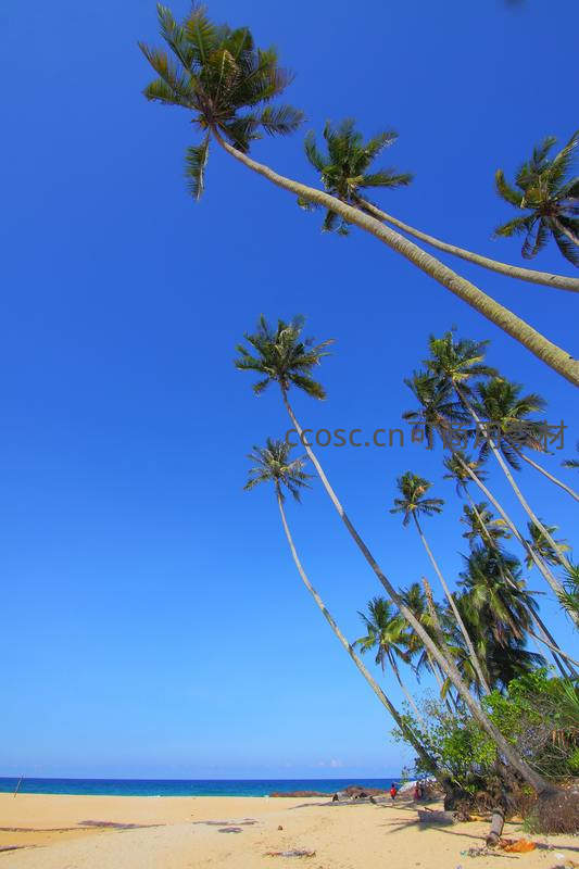 湛蓝无垠的天空下,高大椰树向一侧倾斜,枝叶随风轻舞,金黄沙滩与碧海相接,洋溢着浓郁的热带风情与度假气息。