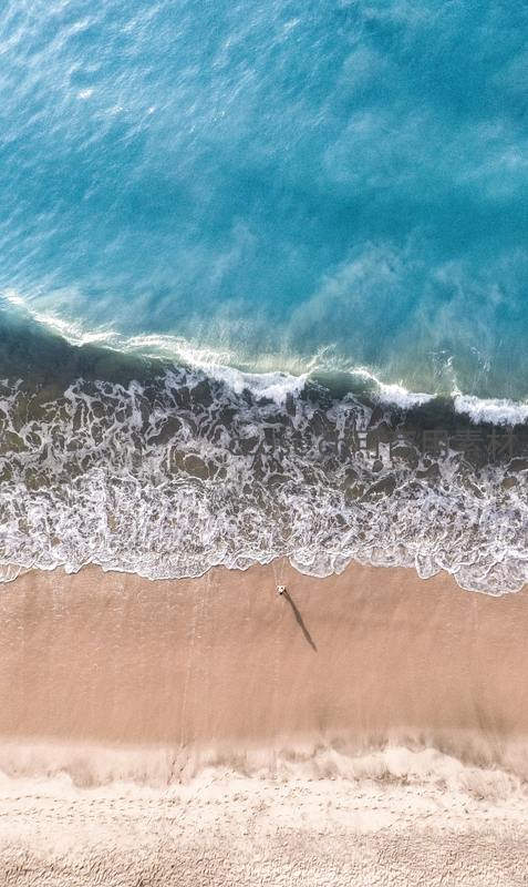 从高空俯视,一个渺小的身影独自走在宽阔的沙滩上,身后是层层叠叠拍岸的白色浪花。