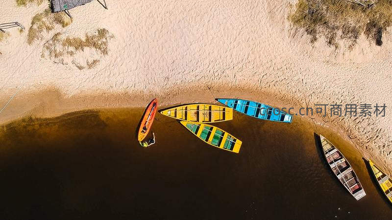 几艘颜色鲜艳的小船整齐地停靠在蜿蜒的河岸沙滩旁,从空中俯瞰构成一幅充满活力的休闲画面。