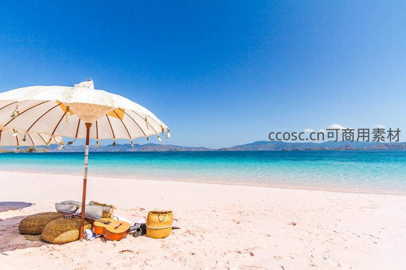 一把白色的热带风格遮阳伞立在洁白的沙滩上,旁边放着吉他和编织篮,远处是湛蓝的大海和青山。