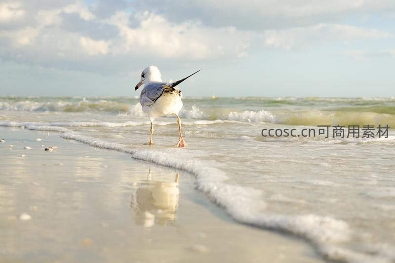 一只海鸥正优雅地在被海浪浸湿的沙滩上踱步,它清晰的倒影映在水面上,背景是翻滚的波涛。