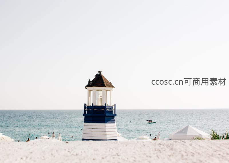 一座蓝白相间的装饰性灯塔矗立在洁白沙滩上,背景是无垠碧海与晴空,远处有游船点缀,充满度假风情。