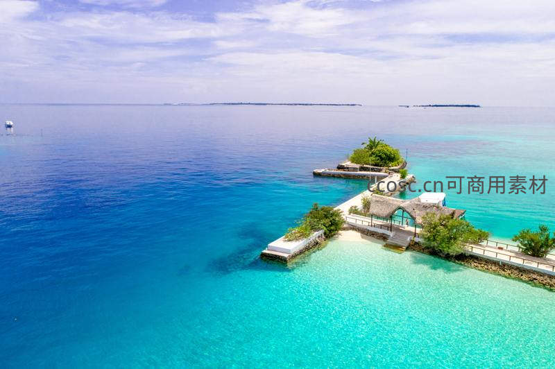 从高空俯瞰,蜿蜒的栈桥连接着绿意盎然的小岛,四周环绕着层次分明的碧蓝海水,宛如人间天堂般的度假胜地。