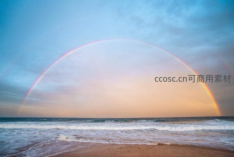 一道完整的彩虹优雅地跨越在波涛汹涌的海面之上,夕阳余晖为天空染上温暖色彩,美不胜收。