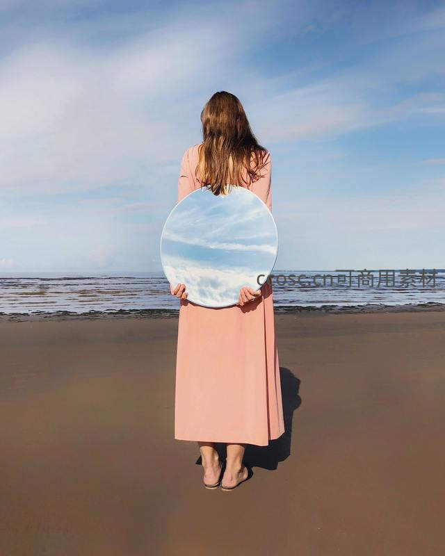 一位身着粉色长裙的女子背对镜头,手持圆形镜子,镜中倒映着蔚蓝天空与白云,营造梦幻艺术感。