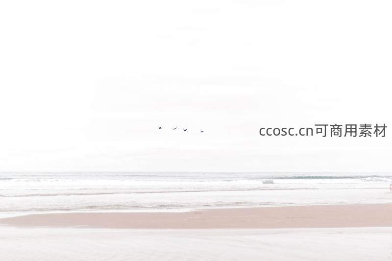 灰白调的空旷海滩上,几只飞鸟掠过天际,构图极简却充满诗意,传递出无垠与孤寂之美。
