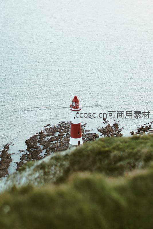红白灯塔屹立礁石守护蔚蓝海域