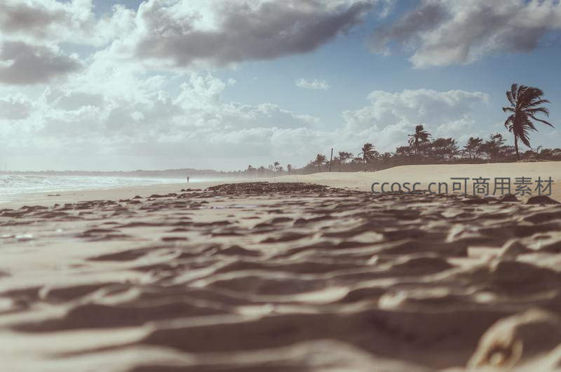 低角度沙丘纹理与远方椰林海景