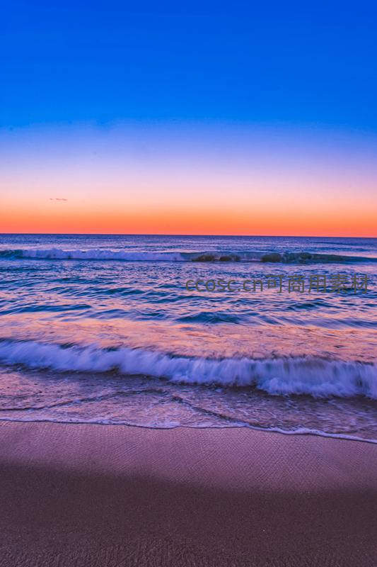 夕阳西下,天空被染成橙红与深蓝渐变,海浪轻柔拍打沙滩,营造出一片宁静祥和的海滨黄昏景象。