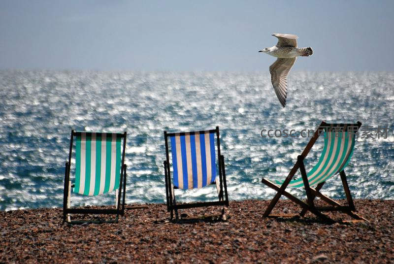 三把条纹沙滩椅静置于石滩之上,一只海鸥振翅飞过波光粼粼的海面,画面充满悠闲惬意的度假氛围。