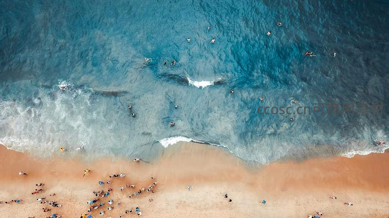 从高空俯瞰,金色沙滩上人影点点,碧蓝海水波光粼粼,人们在海边嬉戏游泳,享受夏日的惬意时光。