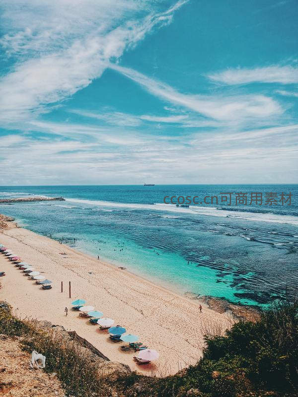 沙滩度假胜地,晴空碧海遮阳伞成排