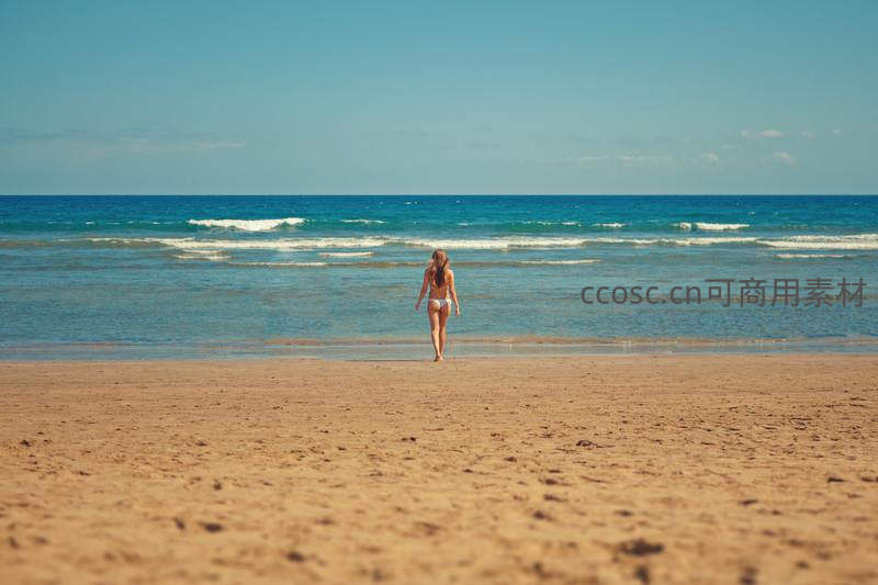一位身着比基尼的女子独自漫步在广阔无垠的金色沙滩上,背对镜头走向蔚蓝大海,画面宁静而充满自由遐想。