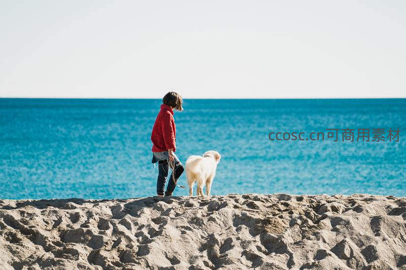 一个穿红衣的少年牵着金毛犬站在沙丘顶端,共同凝望一望无际的蔚蓝大海,画面简单纯粹,充满陪伴的温情。
