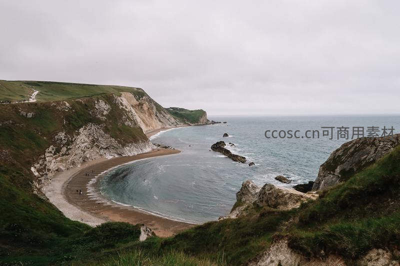高耸绿崖环抱着宁静海湾,灰蓝色海水拍打礁石,展现原始壮阔的自然地貌。