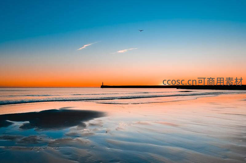 夕阳西下,天空被染成橙红色,海面波光粼粼,远处灯塔与飞鸟的剪影勾勒出一幅静谧而壮丽的海滨黄昏画卷。