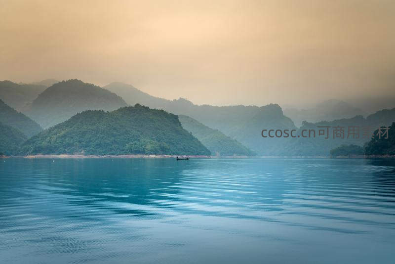 晨雾轻笼群山,碧蓝湖水如镜,一叶扁舟悠然漂浮其间,构成一幅宁静致远、宛如水墨丹青的山水画卷。